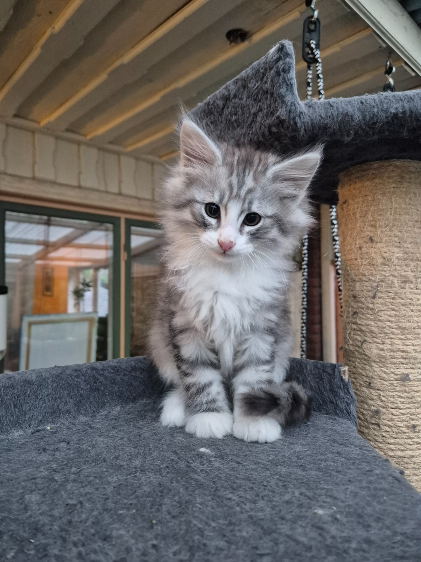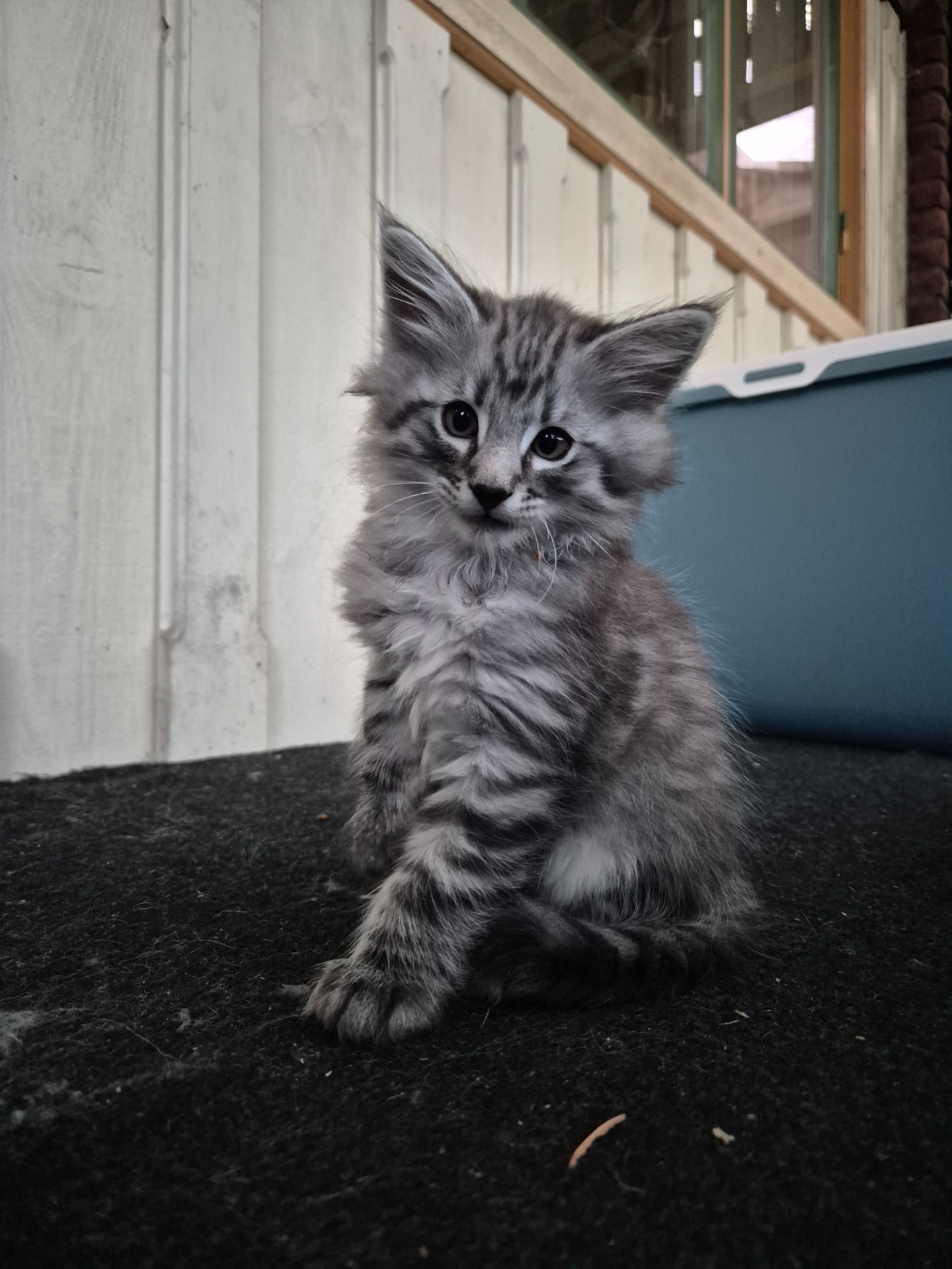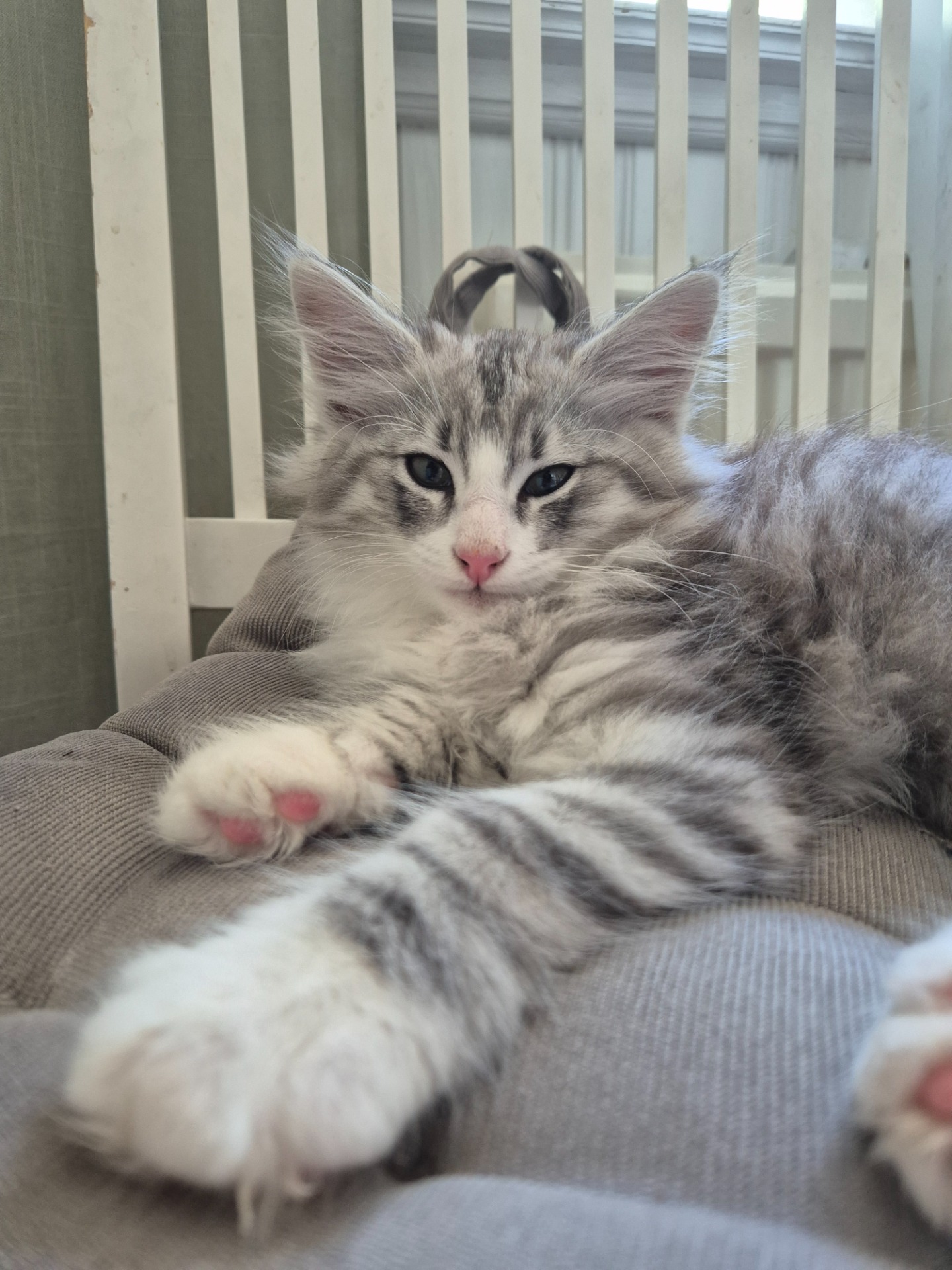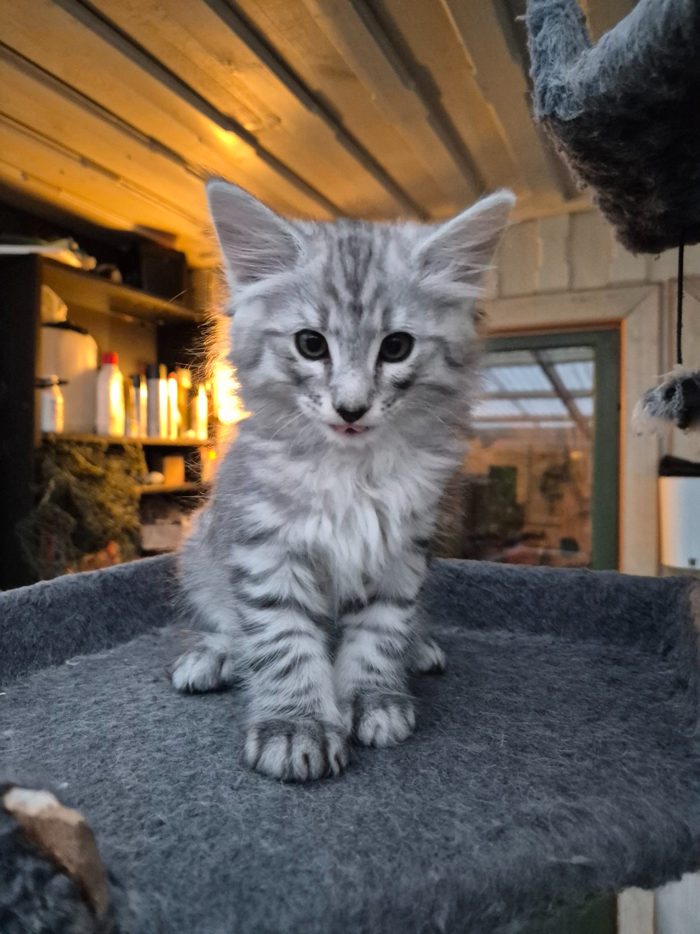 Här har vi Kexet. 🩵 (hane) NFO ns 23 09 (med reservation för förändring) På morgonen när äldsta sonen ritta in i bolådan så sa han "men mamma, det är inte fyra kattungar här, det är fem!" han var vår lilla överraskning. :)